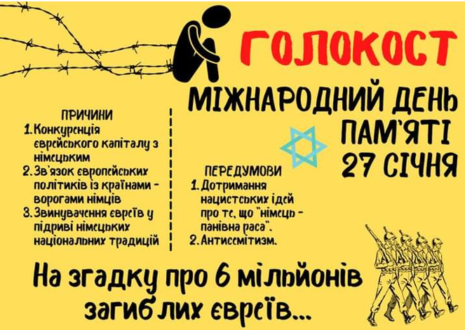 27 січня – Міжнародний день пам’яті жертв Голокосту. Особливою ця дата є для України, на території якої під час Другої світової війни загинуло 1,5 мільйони євреїв – чверть із 6 мільйонів усіх жертв Голокосту. Україна зазнала й інші геноциди на своїй багатостраждальній землі – Голодомор 1932 – 1933 рр., знищення ромів під час Другої світової, депортацію кримськотатарського народу, і сучасну трагедію: Верховна Рада України визнала дії збройних сил російської федерації та її політичного і військового керівництва під час останньої фази збройної агресії, яка розпочалася 24 лютого 2022 року, геноцидом Українського народу. У чому зміст відзначення Дня пам’яті жертв Голокосту, і які уроки людство винесло з тої трагедії розглянули учні 9 – 11 класів на годинах спілкування «Голокост – вічний урок людству».